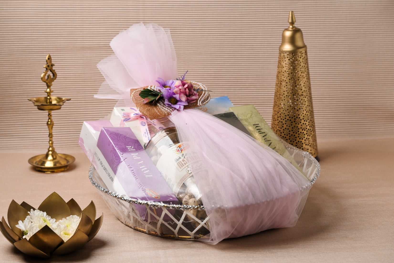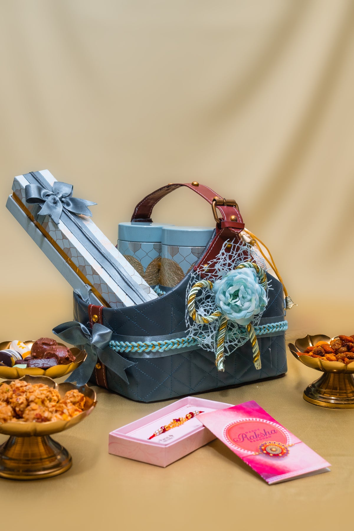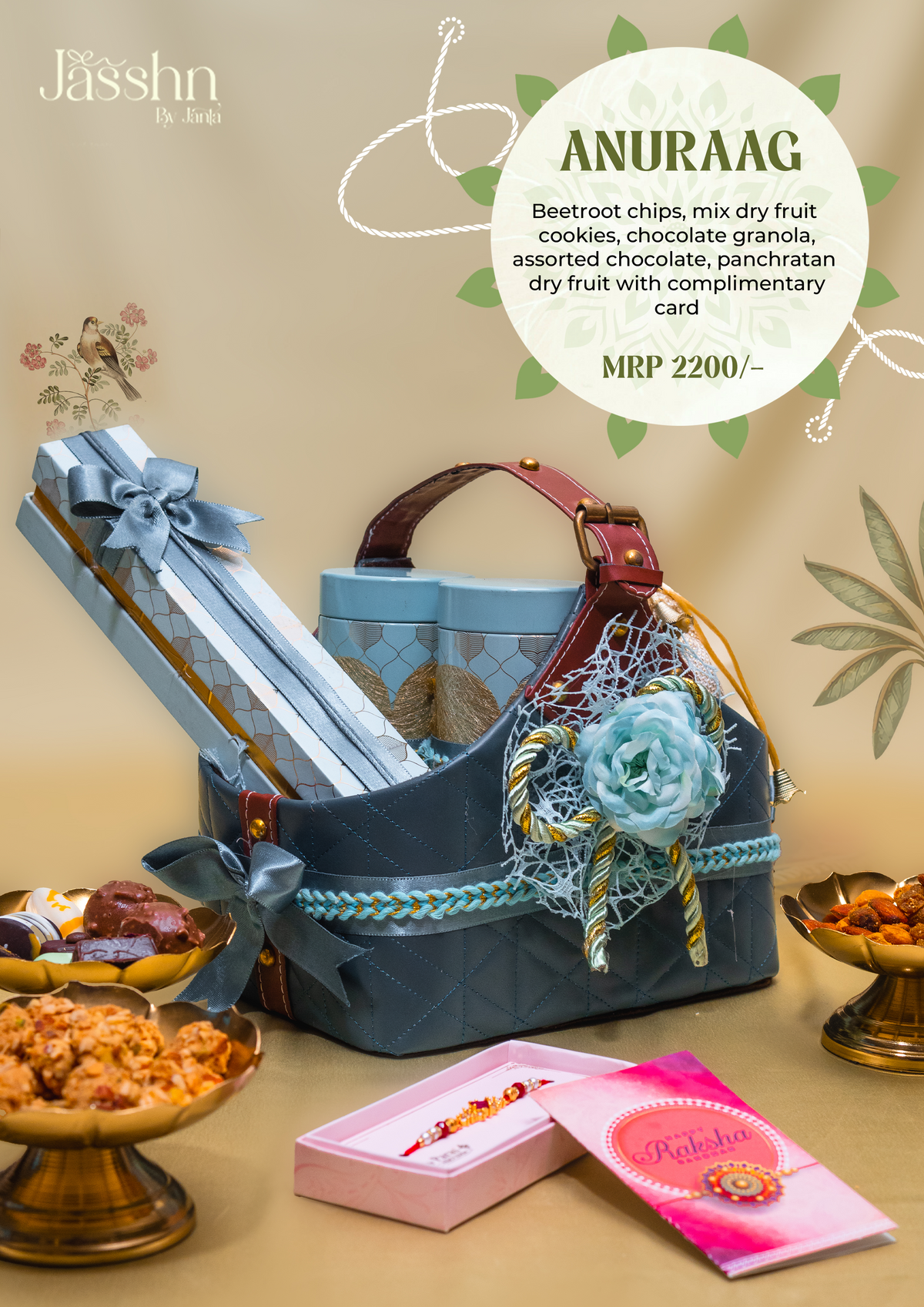 Beetroot chips, mix dry fruit cookies, chocolate granola, assorted chocolate, panchratan dry fruit with complimentary card